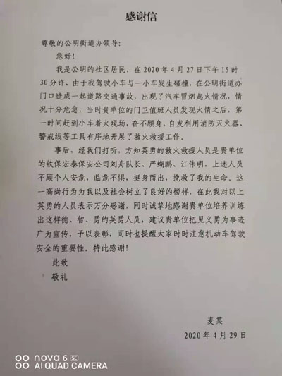 我是公明的社區(qū)居民,在2020年4月27日下午15時30分許,由于我駕駛小車與一小車發(fā)生碰撞,在公明街道辦門口造成一起道路交通事故,出現(xiàn)了汽車冒煙起火情況,情況十分危急,當(dāng)時貴單位的門衛(wèi)值班人員發(fā)現(xiàn)火情之后,第一時間趕到小車著火現(xiàn)場,奮不顧身,自發(fā)利用消防滅火器、