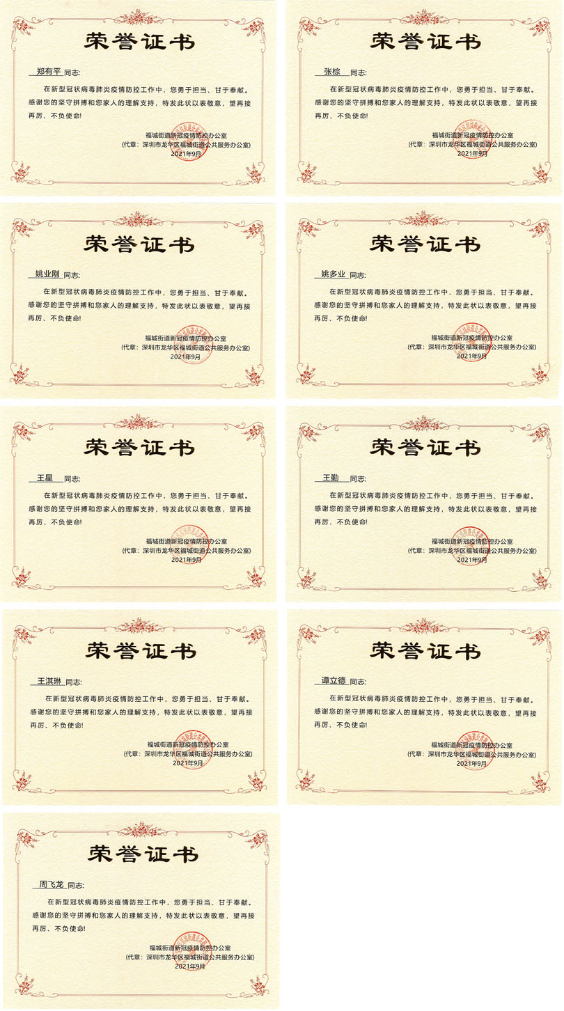 熱烈祝賀我司鐵保宏泰深圳保安公司多名保安精英隊員榮獲深圳市龍華區福城街道疫情防控辦公室辦法的積極防控工作榮譽證書。