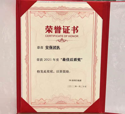 熱烈祝賀我司鐵保宏泰深圳保安服務(wù)公司安保團隊榮獲58同城頒發(fā)2021年度最佳后盾獎。