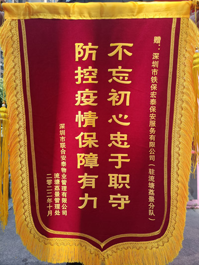 深圳市聯合安泰物業管理有限公司流塘荔景管理處贈送錦旗我司鐵保宏泰深圳保安公司駐流塘荔景分隊,不忘初心忠于職守,防控疫情保障有力。