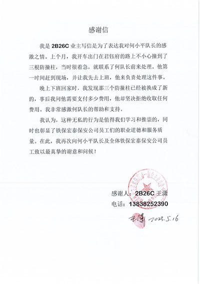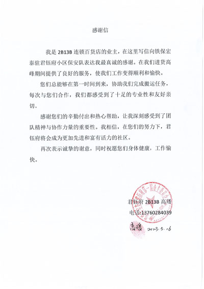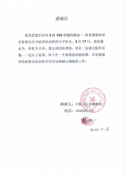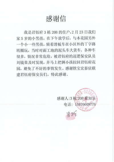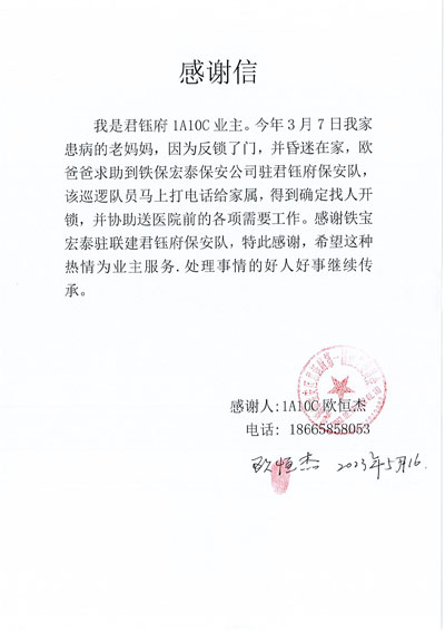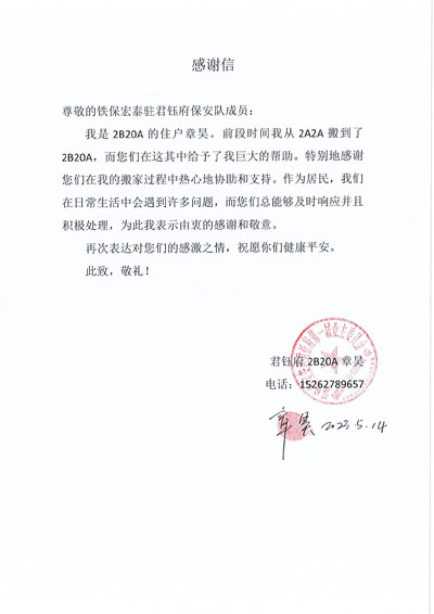深圳市寶安區君鈺府小區業主致信感謝鐵保宏泰深圳保安公司駐聯建君鈺府保安隊安保隊員。感謝鐵保宏泰保安隊員為君鈺府的付出及生活的各種幫助。鐵保宏泰保安公司熱情為業主服務每一天。