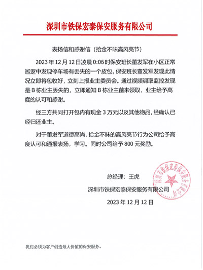 2023年12月12日凌晨0:06時鐵保宏泰深圳保安公司保安班長董發軍在小區正常巡邏中發現停車場有丟失的一個皮包,發現此情況立即將皮包上報業主委員會,再通過視頻調取監控發現是B棟業主丟失,經三方共同打開包內有現金3萬元以及其它物品,經確認已經歸還業主。業主給予高度的認可和感謝。對于董發軍道德高尚,拾金不昧的高風亮節行為公司給予高度認可和通報表揚、學習。同時鐵保宏泰保安公司給予800元獎勵。