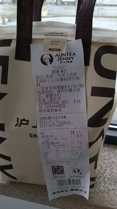 11月19日保安門崗突然收了個外賣說是送給保安的,經確認才知道是那天那個女孩子點的送給保安員的。