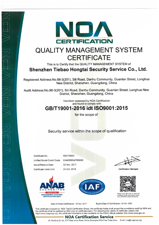 熱烈祝賀深圳市鐵保宏泰保安服務有限公司榮獲質量管理體系認證證書(英文版)。