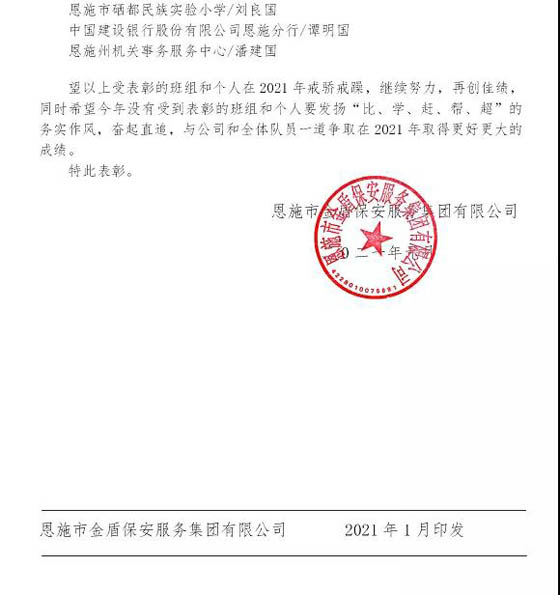 2020年,恩施市金盾保安服務(wù)集團有限公司在州、市公安局黨委和內(nèi)保部門的正確領(lǐng)導(dǎo)和大力支持下,在社會各界的積極幫助下,在全體隊員的共同努力下,較為圓滿的完成了既定工作目標(biāo),公司各項工作都在向著良好的方向發(fā)展,期間涌現(xiàn)出一批先進班組、先進班組長、優(yōu)秀隊員、先進個人、優(yōu)秀黨員和部分作出突出貢獻的個人,經(jīng)一線班組民主評議,結(jié)合客戶單位意見,金盾保安服務(wù)集團公司研究討論,決定對下列班組和隊員予以表彰:
