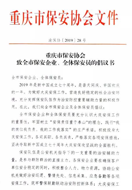 2019年9月23日,重慶市保安協(xié)會向全市保安企業(yè)、全體保安員發(fā)出倡議書,倡議全市保安企業(yè)及保安從業(yè)人員,不忘初繼續(xù)前行、敢于吃苦、樂于奉獻(xiàn),為全市經(jīng)濟(jì)社會發(fā)展穩(wěn)定作出更大貢獻(xiàn),為新中國七十周年華誕獻(xiàn)禮!