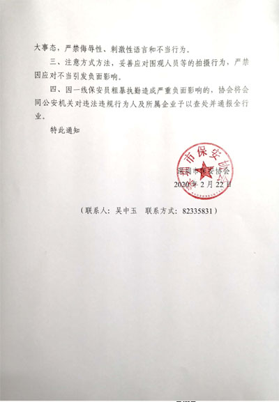 四、因一線保安員粗暴執勤造成嚴重負面影響的,協會將會同公安機關對違法違規行為人及所屬企業予以查處并通報全行業。