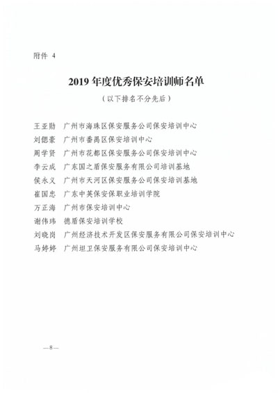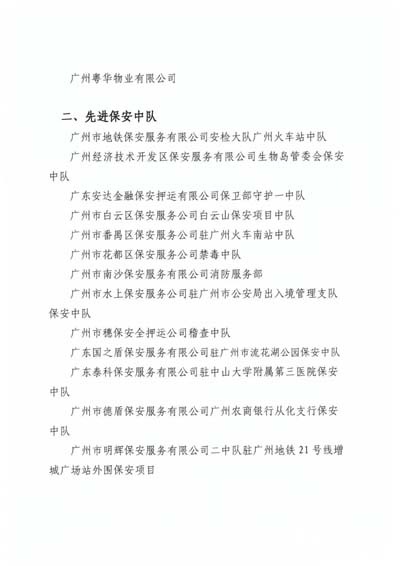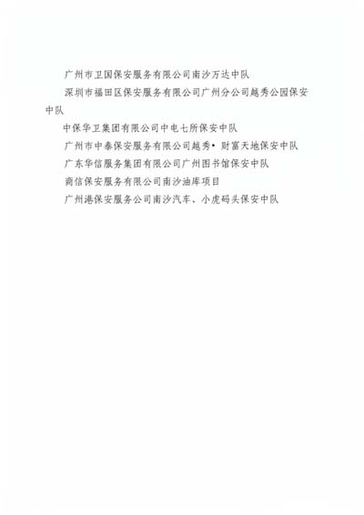 為掀起行業學先進、趕先進、爭先進的良好氛圍,推動我市保安服務行業健康發展,經過自評、初評、專家復核、會長辦公會審議后公示等評選程序,協會決定授予廣州市天河區保安服務公司等36個單位(含中隊)“廣州市保安協會2019年度先進保安集體”榮譽稱號;授予廣州市保安服務總公司等10個單位“廣州市保安協會2019年度最具發展潛力保安服務企業”榮譽稱號;授予廣州市番禺區保安培訓中心等3個單位“廣 州市保安協會2019年度優秀保安培訓單位”榮譽稱號;授予王亞勛等10名培訓師“廣州市保安協會2019年度優秀保安培訓師”榮譽稱號(名單詳見下文)。